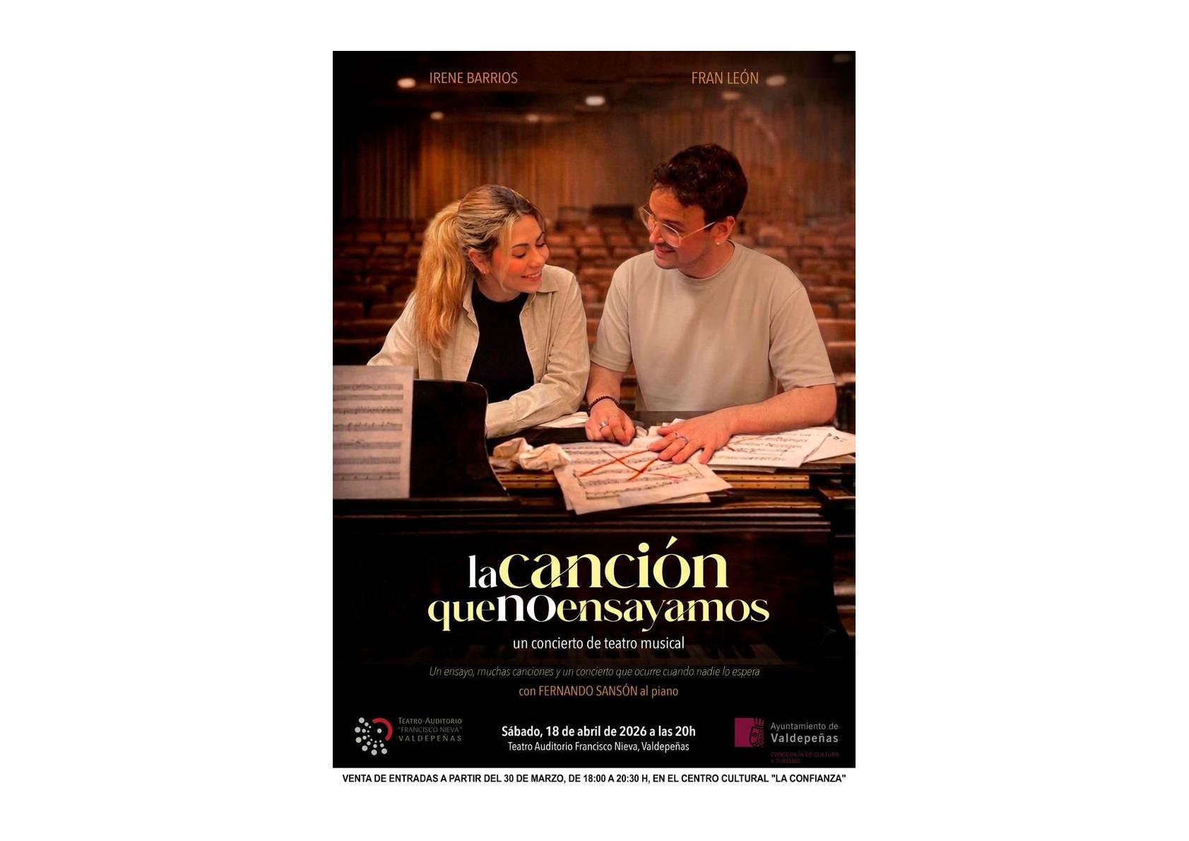 El sábado 18 de abril a las 20.00 horas en el Teatro-Auditorio “Francisco Nieva” tendrá lugar  “La canción que no ensayamos“, un concierto de teatro musical de Irene Barrios y Fernando Sansón al piano.