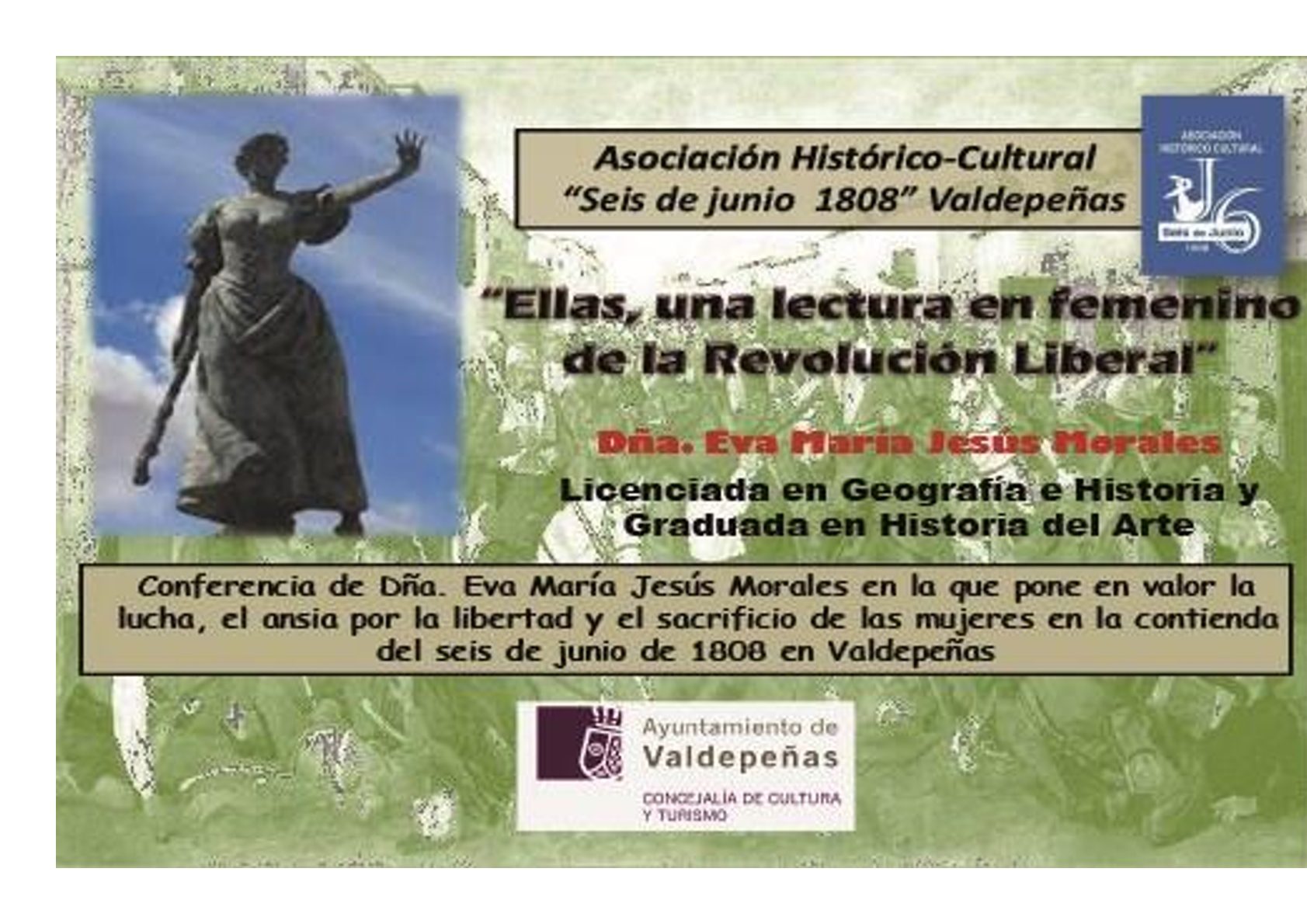 Entre ellas, destaca la Conferencia impartida pro Eva María Jesús Morales bajo el título “Ellas, una lectura en femenino de la Revolución Liberal” en al que pone en valor la lucha, el ansia por la libertad y el sacrificio de las mujeres en el contienda del 6 de junio de 1808 en Valdepeñas.