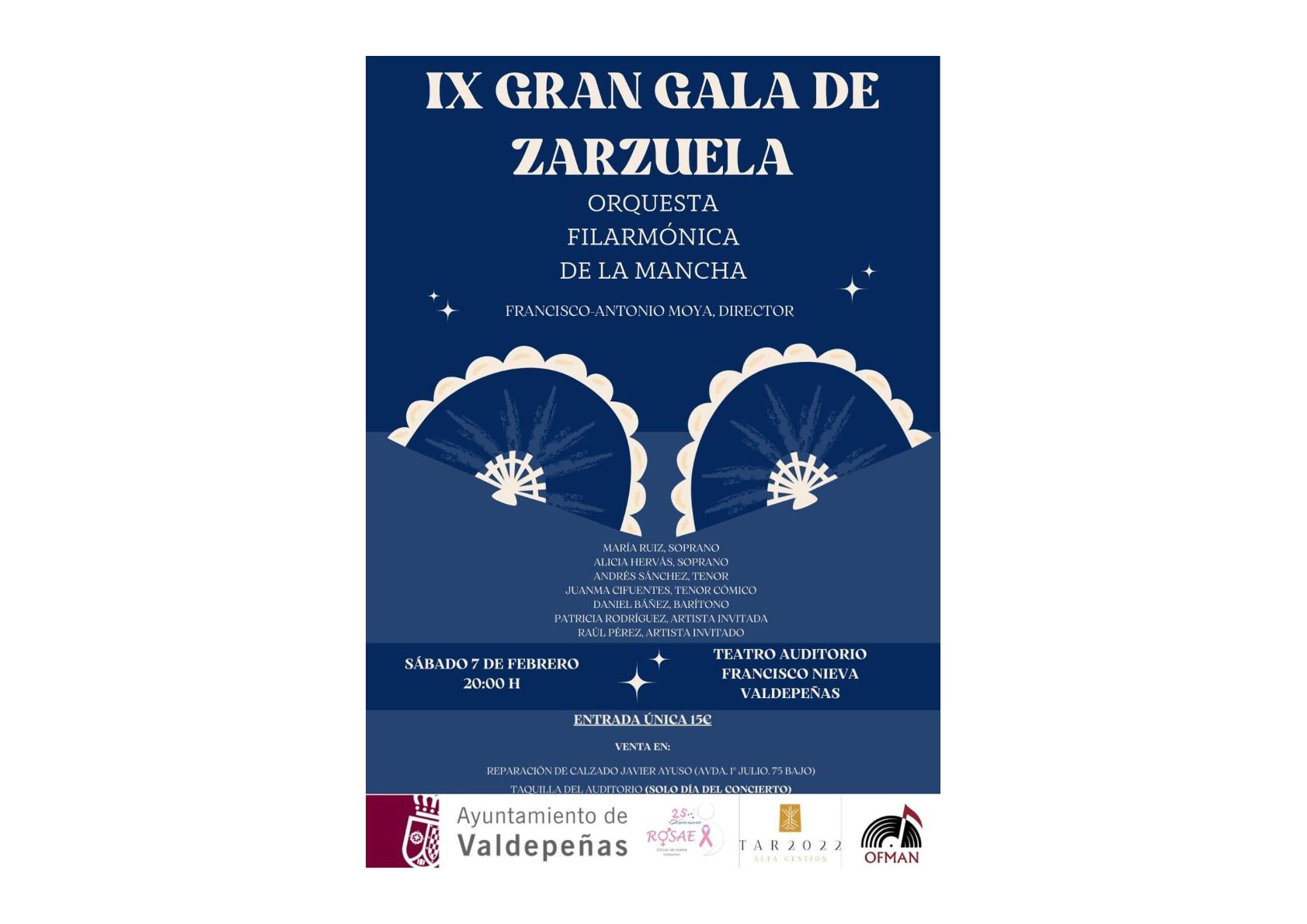 El sábado 7 de febrero, a las 20.00 horas en el Teatro-Auditorio “Francisco Nieva” tendrá lugar la IX Gran Gala de Zarzuela, a cargo de la Orquesta Filarmónica de la Mancha, dirigida por Francisco Antonio Moya y con la colaboración de solistas líricos.
