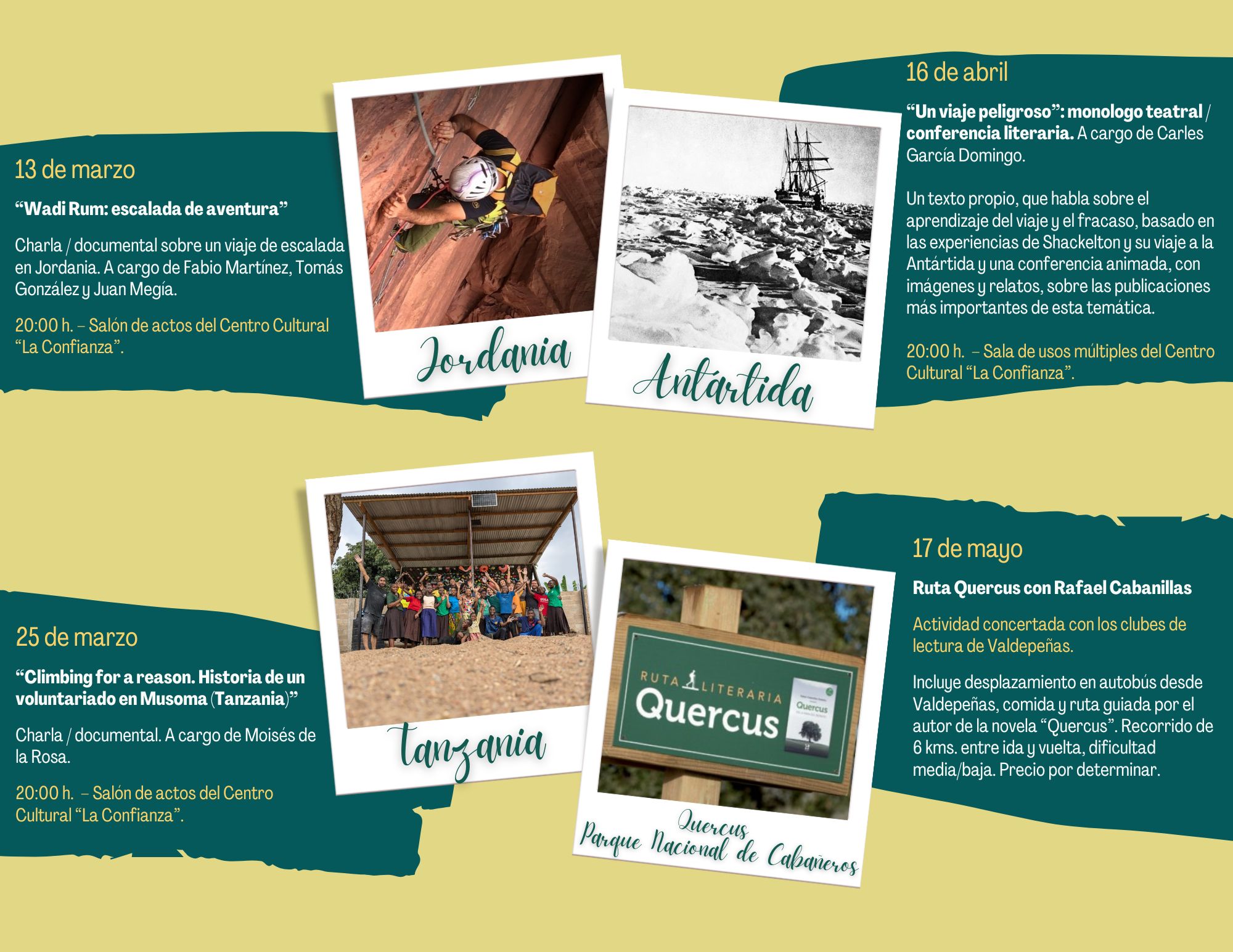 El 25 de marzo, también a las 20:00 horas, en el salón de actos del Centro Cultural ‘La Confianza’, tendrá lugar la charla y documental ‘Climbing for a reason. Historia de un voluntariado en Musoma (Tanzania)’, impartida por Moisés de la Rosa, en la que se relatará una experiencia de voluntariado vinculada al mundo de la escalada.