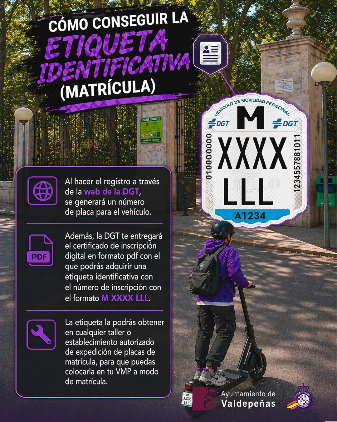 Al registrar el patinete en la web de la DGT se generará un número de placa para el vehículo. Además, la DGT entregará al usuario el certificado de inscripción digital en formato pdf con el que se adquirir una ‘etiqueta identificativa’, a modo de matrícula. La etiqueta se podrá retirar en cualquier taller o establecimiento autorizado de expedición de placas de matrícula, para que se puede colocar en el VMP a modo de matrícula.