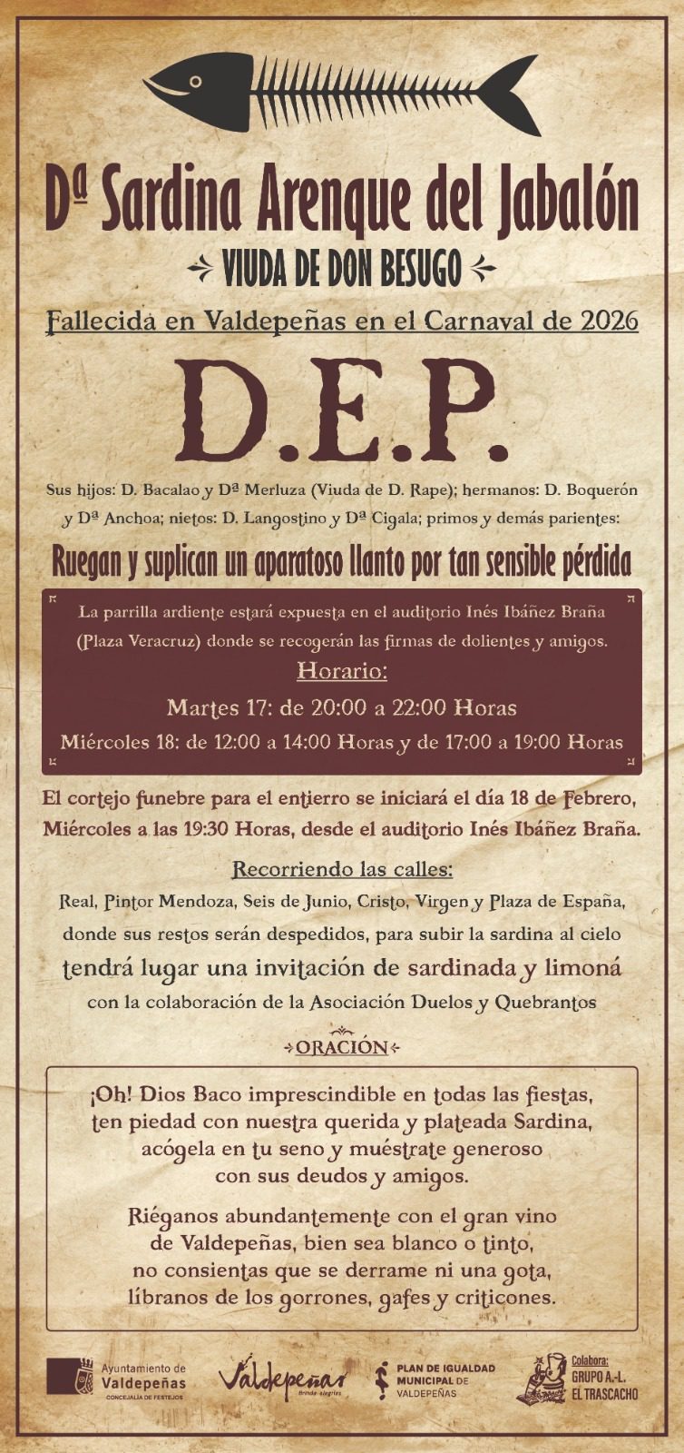 Con los restos mortales de Dª. Sardina Arenque, Marquesa del Jabalón, donde los dolientes recibirán las condolencias de los/las vecinos/as de Valdepeñas.